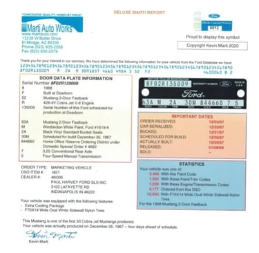 Limited 428 Cobra Jet Mustang production began with a run of 50 (enough to qualify for NHRA stock racing classes) non-GT fastbacks (body style 63A) that were scheduled for assembly at the Dearborn assembly plant on December 30, 1967. The VINs were serialized consecutively starting with 8F02R135007 and ending with 8F02R135056. All were painted Wimbledon White and equipped with a black vinyl interior (code 2A), heavy duty 4-speed manual transmission (code 5), manual drum brakes, and (code 7 (3.25:1) door tag code notwithstanding) a 3.89:1 rear axle ratio. 30 of the vehicles were assembled with seam sealer and sound deadener (noted by DSO code 844660) and 20 were built without seam sealer and sound deadener (noted by DSO code 844661).